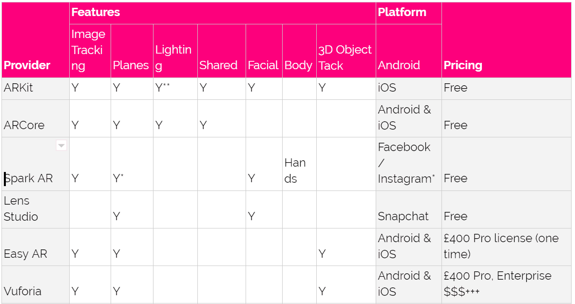 I’ve created a table of what features each of the AR technology providers offer. I’ve not included wearable AR (like Hololens and Magic Leap) for now, because availability of these devices are so limited currently so it’s not a mass consumer proposition yet. However we will update in the near future.